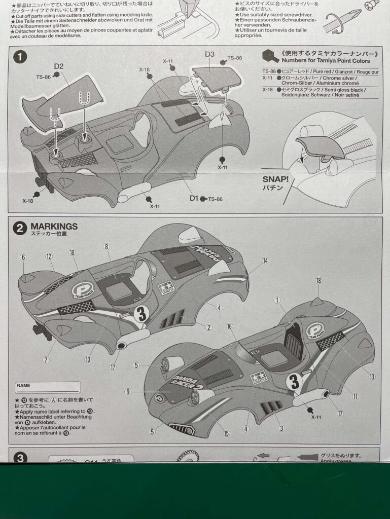 スーパー2シャーシ ミニ四駆パンダ2ボディーの組み立てです。マニュアルの①、②です。